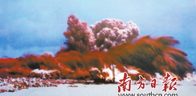 1992年12月28日,珠海机场炮台山用1.2万吨TNT炸药进行定向爆破时壮观场景,后被称为“亚洲第一爆”。