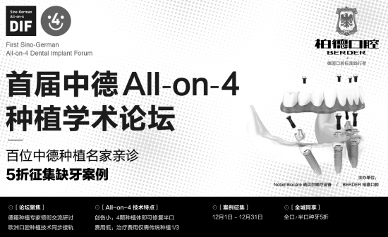 为了倡导和推广All-On-4口腔种植技术在华南地区的临床应用,Nobel Biocare诺贝尔医疗设备即将联手柏德口腔于2015年12月16日在广州市国德国际大酒店举办首届中德All-On-4种植学术论坛。届时,将有百位中德口腔种植名家齐聚现场,共同研讨All-On-4种植技术的临床应用,并针对南方人口骨情况特点的案例进行研讨及分享,还将有德国专家用该技术种牙的直播。