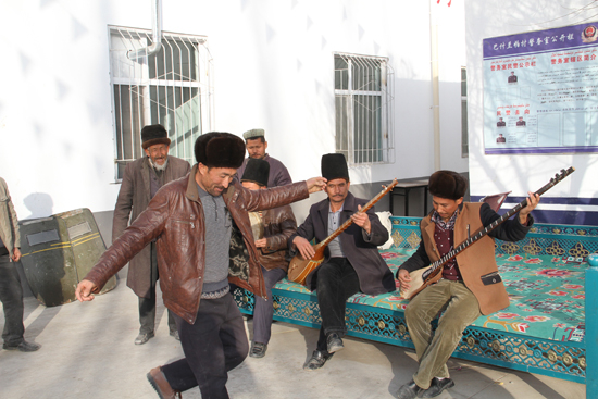 2015年3月到村里之后,自治区国资委“访惠聚”工作组开始发现村里的这一现象。自此,工作组开始买乐器,在村委会设立音乐室。大伙不敢在家里弹琴,那就到村委会来。
