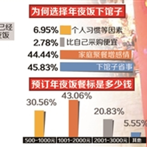 记者注意到,市民吃年夜饭,既要吃出年味又非常注重面子。调查显示,市民选择吃年夜饭的地方也有讲究,63.89%的人注重酒店环境,并将其列为选择就餐地的第一因素,其次是地点的熟悉度,第三才是价格。