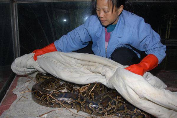 天气冷了,深圳野生 动物园的饲养员为 蟒蛇盖上棉被保暖