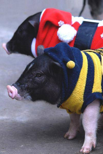 深圳野生动物园的香猪穿上饲养员为它们量身定做的新冬衣。 来自热带的动物们用上了取暖器,再冷点,大象和长颈鹿也要烤木炭火