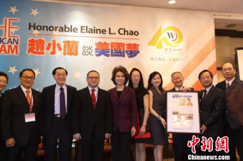 当地时间12日,美国《世界日报》在纽约举行创刊40周年庆祝茶会。美国前劳工部部长赵小兰在茶会后发表专题演讲。图为福茂集团董事长赵锡成博士(左二)、美国前劳工部部长赵小兰(左四)与北美《世界日报》总管理处总