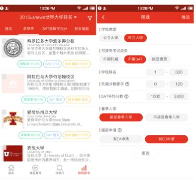 学校的选择总是让学生和家长非常纠结。在选择过程中既要考虑学生自身的申请条件,又要考虑录取成功率和学校排名,争取以最低的代价申请到最好的学校。顺顺留学的院校库正是为解决这个问题而开发的。在这里你可以根据不同的条件对学校进行排序。同时还可以筛选学校类型、接受考试种类,设定学校排名范围以及托福雅思考试分数等等。你能想到的这里都有,这些精确的筛选条件让你快速找到最满意的学校。