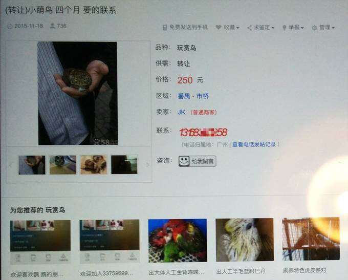鸟类爱好者林先生今年11月无意中发现58同城网上有一则转让“小萌鸟”的帖子,上面挂着猫头鹰和老鹰的图片,明码标价250元一只,交易地点在广州番禺市桥。“这些可都是国家二级保护动物。”林先生想一探究竟,就添加卖家的微信,他发现对方的朋友圈“经常发鸟的图片,而且言及买卖”。