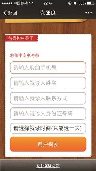 进入页面后请您选择需要的名医,我们已经将各位名医擅长的领域详细进行了说明,接下来就试试您的手气“刮一刮”吧!如果抢号成功,将会弹出一个窗口,您需要填写您的手机号码,以及就诊者的姓名、身份证号码、手机号码,然后在我们提供的专家门诊时间中勾选一个,最后提交。请谨慎填写证件信息,一旦抢号成功,不能修改。提醒:每个微信号一天只有一次刮卡的机会,今天没刮中,明天可以再刮。
