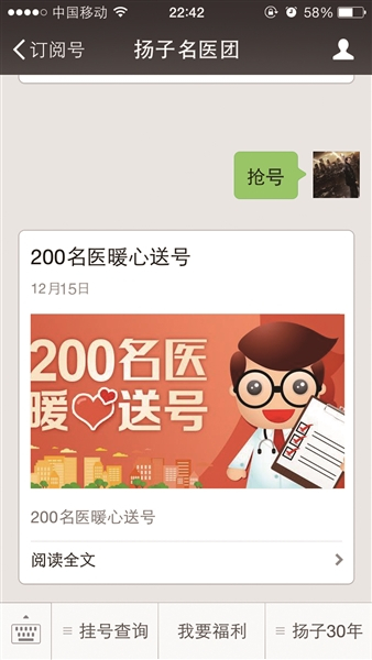 在指定开始时间(上午10点),发送暗号“抢号”给“扬子名医团”,就会收到抢号页面,点击进入,即可参加抢号活动。