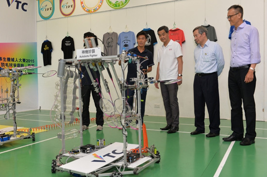 此外,梁振英观看了一场机械人羽毛球赛,这个机械人上月出战有六间大专院校参加的“全港大专生机械人大赛2015”,在羽毛球赛中击败多支大学队伍,勇夺亚军。