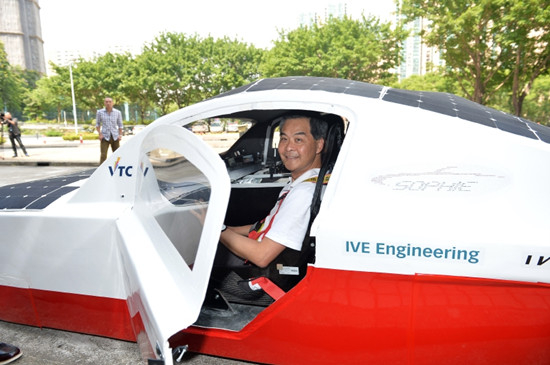梁振英亦试坐由学生参与研发的第五代太阳能电动车SOPHIE V,该车将出战今年10月于澳洲举行的“世界太阳能车挑战赛2015”。