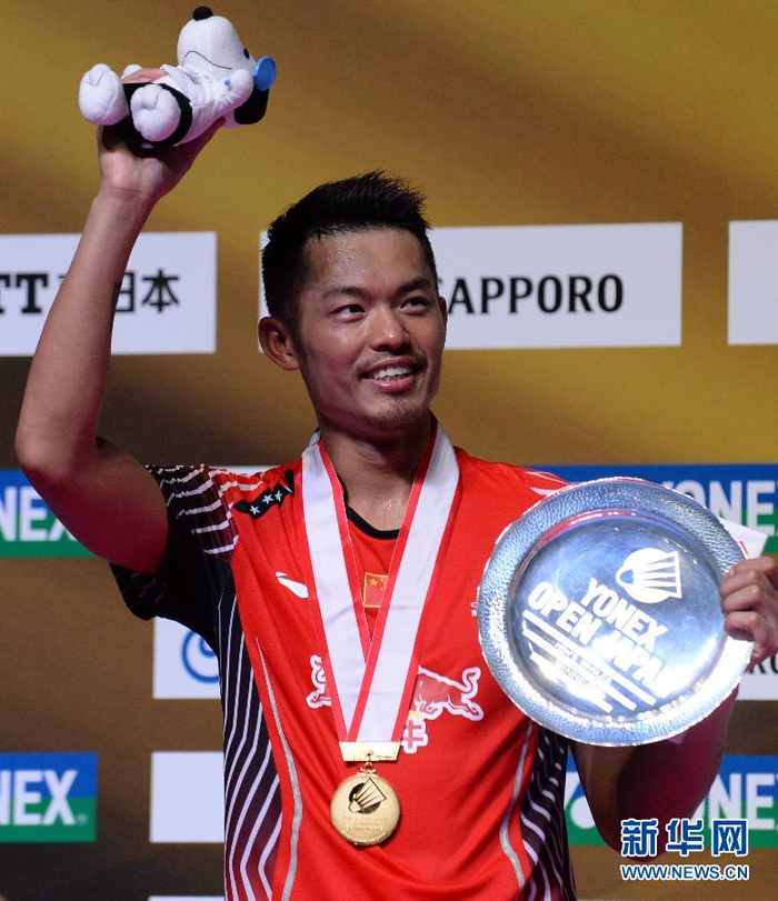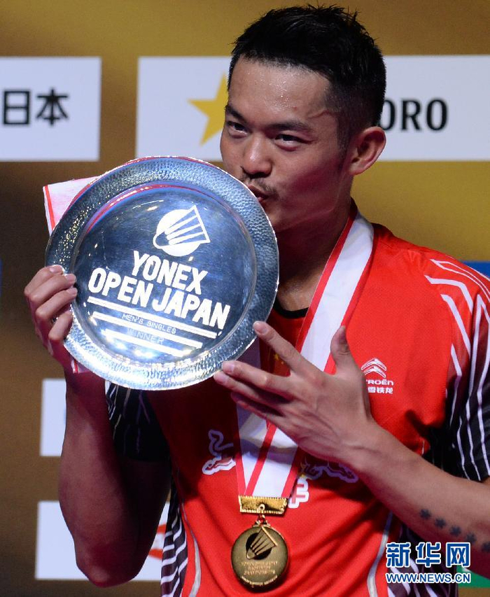 9月13日,中国选手林丹在颁奖仪式上。当日,在日本羽毛球公开赛男单决赛中,中国选手林丹以3比1战胜丹麦选手阿萨尔森获得冠军。 新华社记者马平摄
