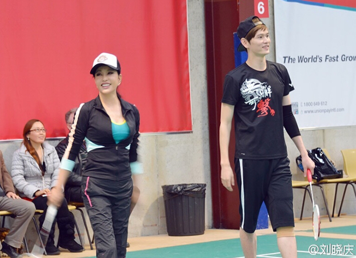 刘晓庆穿低胸装打羽毛球