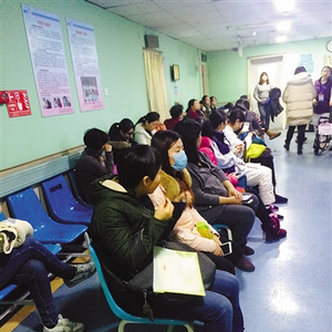 海淀区妇幼保健院,B超室门口,孕妇们在排队等候。