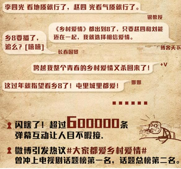 《乡村爱情8》(上)以超强口碑和腾讯视频的强势运营,开播3天共吸引了60万网友参与弹幕互动。社交媒体上对于该剧的关注度更迅速飙高,由腾讯视频推出的#大家都爱乡村爱情#话题,占据电视剧话题榜第一名、话题总榜第二名。