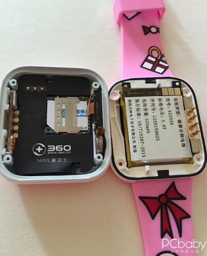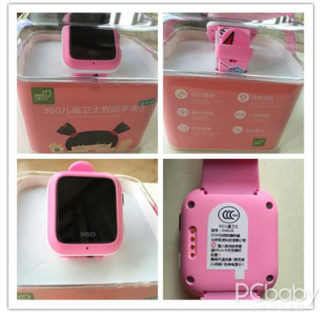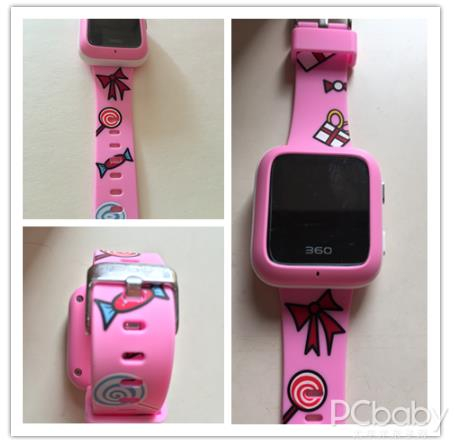 手表整体设计风格简洁大方又不失可爱风格,黑色酷炫正方形显示屏,显示屏下方有明显的360LOGO,LOGO下方有个小孔--麦克风。粉色腕带上面还印有各种可爱的图案:蝴蝶结、糖果、礼物盒等,值得一提的是,360这款腕表的带子采用了低敏硅胶材质,可以防止宝贝佩戴后出现皮肤过敏或皮肤磨损的情况,可谓非常贴心和用心的设计。