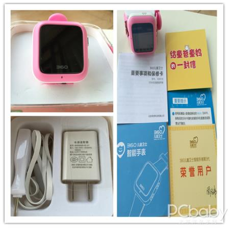 粉红色的包装盒分为2层,最上面是360的智能手表,下面一层是配件,包括充电器、手表专用螺丝刀和备用螺丝钉、手表贴膜、以及说明书、保修卡等。