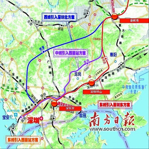 当前,对于赣深铁路的初步设计,有东线、中线、西线三套备选方案。其中,东线方案为高铁从惠州经深圳坪山站后到达深圳北站,西线方案为惠州经过东莞塘厦后进入深圳北站。