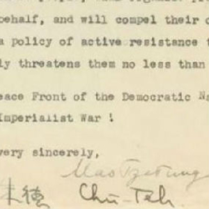 这封信以“民主国家对抗法西斯主义与帝国主义战争的和平阵线万岁!”作结,信上也有朱德的签名。