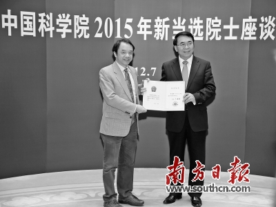 12月7日,中科院2015年新增选院士61名。当天,中科院院长白春礼(右)向新当选的院士王贻芳(左)颁发院士证书。新华社发