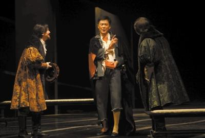 还有网友特别总结了那些“不能忍”的翻译:首先,《甄嬛传》被翻译成了《Empresses in the Palace》(宫中的后妃们),“一丈红”成了“The scarlet red(罪孽深重的红)”,“惊鸿舞”变身“Flying WildGoose”(飞翔的野鹅),皇后的名言“臣妾做不到啊”,被翻译成了“I truly can not bear it”(我真的不能忍啊),华妃的金句“贱人就是矫情”被无情删除,有人猜测:这是美国人翻译不出来,直接放弃了么?资料图:北京人艺当家小生王斑(中)领衔“混血版”《哈姆雷特》。 图片来源:新京报 王飞 摄