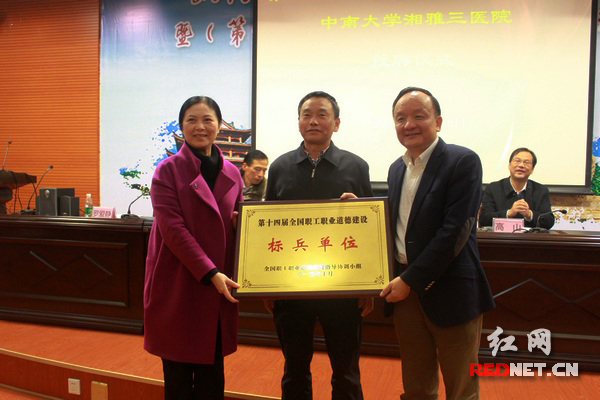 湖南省总工会党组副书记、副主席钟小汨(中)为中南大学湘雅三医院授牌。