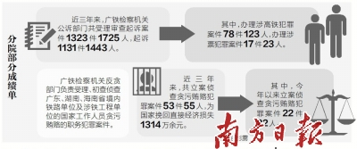 广铁检察机关反贪部门负责受理、初查侦查广东、湖南、海南省境内铁路单位及涉铁工程单位的国家工作人员贪污贿赂的职务犯罪案件。近三年来,共立案侦查贪污贿赂犯罪案件53件55人,为国家挽回直接经济损失1314万余元。其中,今年以来立案侦查贪污贿赂犯罪案件22件22人。