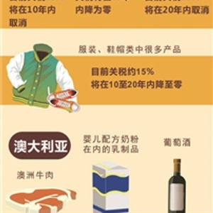 澳大利亚目前是中国最大的牛肉进口来源国,目前澳洲牛肉15%的平均关税将在10年内降至零;包括婴儿配方奶粉在内的乳制品将在4年内免关税进入中国;5年过渡期后,葡萄酒平均税率将从目前的34.7%降为零。