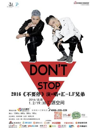 演唱会定档元旦假期2016年1月2日于五棵松汇源空间举办,LF兄弟《不要停》2016北京演唱会,快乐燥起来!本稿件所含文字、图片和音视频资料,版权均属齐鲁晚报所有,任何媒体、网站或个人未经授权不得转载,违者将依法追究责任。