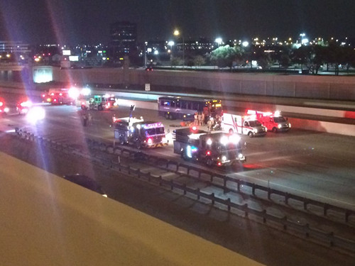 一辆“灰狗”大巴在德州阿灵顿30号州际公路出车祸。
