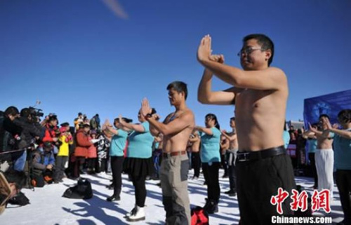 由网友、气功大师、工作人员代表、本地市民等共同组建挑战团,挑战“冰雪神功”。挑战赛以“二郎担山”武术动作为基本动作,参与者人上身赤膊或着一件单衣,由专业气功大师带领开展雪地耐寒挑战赛。据活动主办方工作人员介绍,虽说天气寒冷,但活动主旨是希望市民和游客在中医养生理论指导下,运用特定的方法配合呼吸和意念,来调整内脏活动,加强自身稳定机制,从而达到祛病益寿的目的。