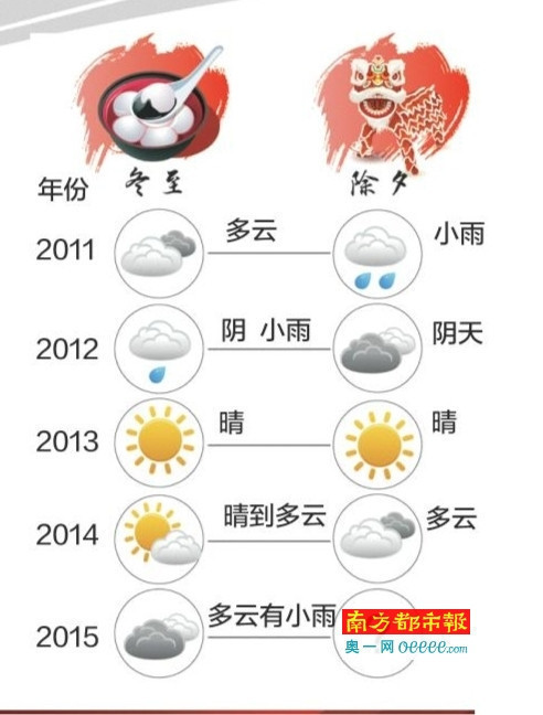 然而,2013年和2014年的气象与谚语就对不上了。2013年冬至日晴天,当年的除夕也是大晴天;2014年冬至日是多云,当年的除夕也是多云。