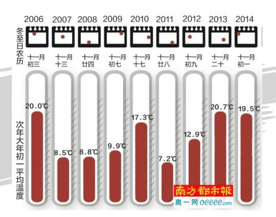 近10年间,冬至出现在农历十一月月头的年份有2006年、2009年、2014年,对照顺德区近10年的温度数据来看,所对应的2007年春节平均气温为20℃,2010年春节日平均气温为9?.9℃、2015年春节日平均气温为19?.5℃。可见,这句谚语在2009年冬至日“失效”了。