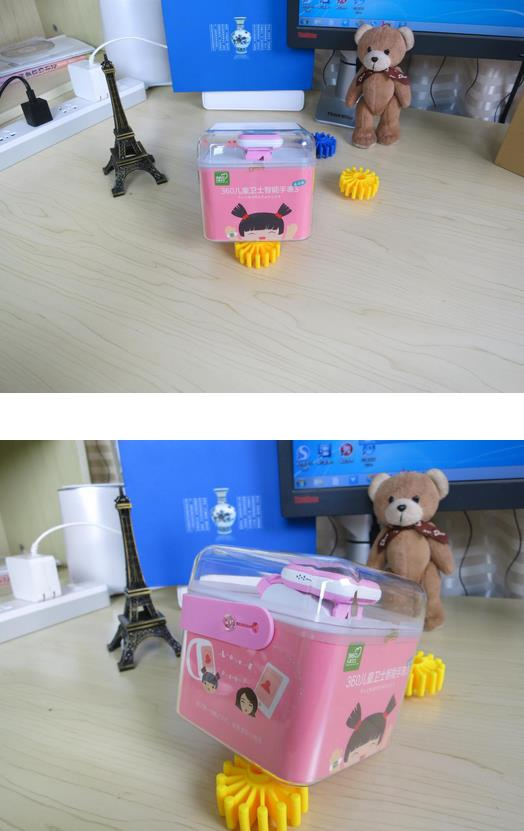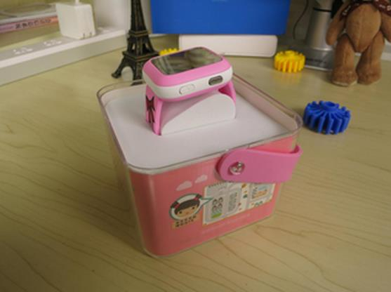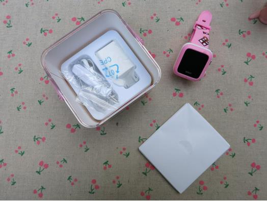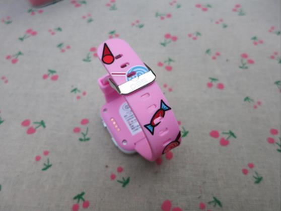 揭下防拆密封打开盒子,可以看到智能手表粉红色的外观。360儿童卫士通话手表三代有粉红、蓝色不同颜色,女孩儿的话多选择粉红色,注意到这个外观,并不是完全粉红,黑色的屏幕外一圈方正的粉红用料,然后表盘中框部分用的是白色的塑料材 质,而表带本身却又是粉红是的,并配有一定图案修饰。
