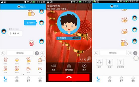 从手表APP客户端来看,主要包括四个应用方面内容,分别为联系、定位、圈子、管理四大方面在联系的界面中,可以支持的功能有语音对讲、拨打电话、发表情、录音、文字表情这些功能,看了下自带的表情,十分丰富,包含了各种场景的内容。