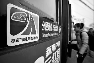 近日,乘客在北京焦化厂公交站乘坐贴有“交通联合”标识的公交车。新华社发