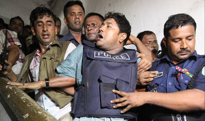 大楼主人拉纳(中间穿警方防弹背心者)成为孟加拉国的全民公敌。网络图片
