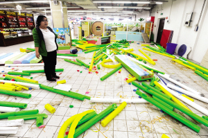 游乐场在一楼重客隆超市内,数名工人正在拆卸游乐玩具,一位身穿黑色袄子的年轻女子监工。记者还以为,这应该就是江先生投诉办卡的那一家,结果不是。