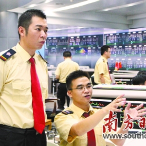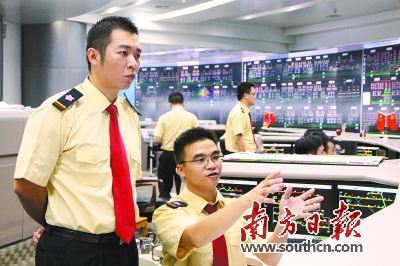 在广州地铁,每个员工都有成才成长的平台和通道。图为广州地铁社会主义核心价值观先进个人郭勇(左)在监控列车运行情况。南方日报记者 符超军 摄