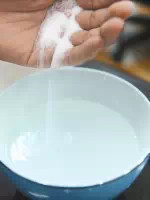 接着,我们往水里加入一勺盐,稍稍搅拌,等到盐充分溶解以后,就可以开始拖地了。