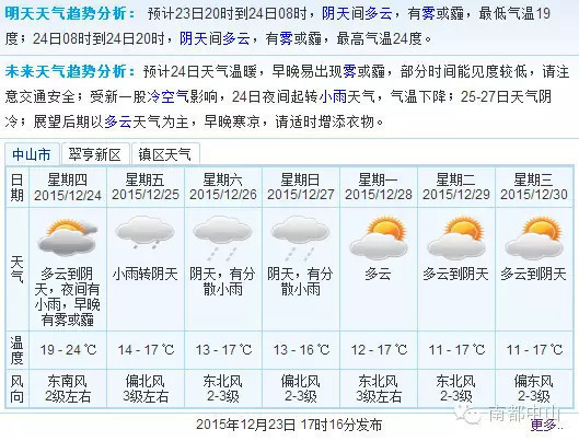 根据预测,24夜间-25日冷空气将自北向南影响中山,届时北风加大,气温下降,并伴有小雨降水,气温14-18度;26日阴天为主,有分散小雨,昼夜温差小,体感温度低,气温13-17度;展望27-28日有冷空气补充影响,中山维持阴冷天气。