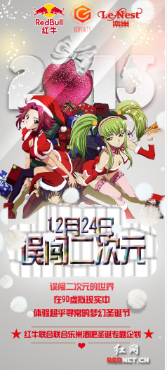 今晚,解放西路乐巢酒吧联合红牛饮料、GoParty自媒体平台,开启了“误闯二次元”主题策划,用当下年轻人热衷的流行元素,打造不一样的圣诞酒吧派对。