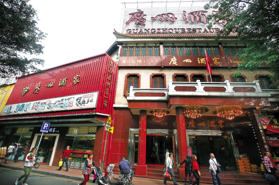 记者来到街坊惦念的文昌路广州酒家,相比起如今新城区的大酒楼,其门面明显不够阔气,但客似云来倒是不假。
