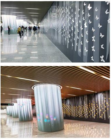 汉中路站是1、12、13号线三线换乘的枢纽大站,通过打造“地下蝴蝶魔法森林”,为换乘之路增添了梦幻色彩,使本站兼具便捷性与艺术性,大幅提升市民出行体验。