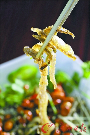 清脆爽口鱼皮搭配多种配料,还没吃就被香气“攻陷”。 广州日报记者何波摄