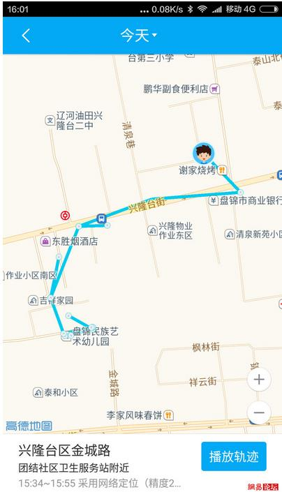 轨迹追踪,可以看见孩子每天都去了哪些地方。在选择轨迹播放的时候,还会自动描绘出孩子行动轨迹的线路。