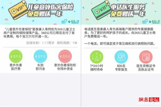 此外,360还会免费赠送一年的电话医生跟一年的儿童意外伤害险。