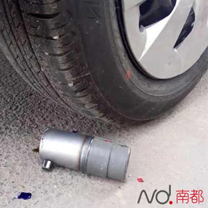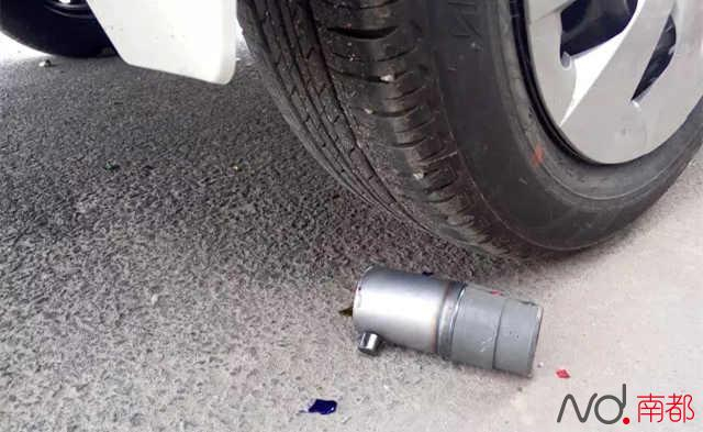 围观市民称,圆柱形礼花底座放在车轮下的确很像炸弹。南都记者祝勇 实习生覃建行摄