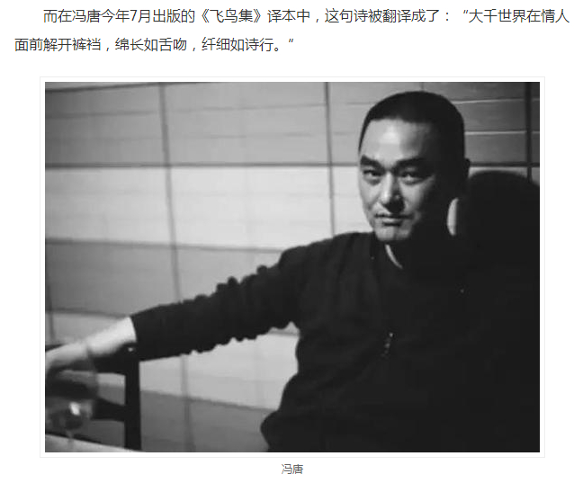 由作家冯唐翻译的泰戈尔名著《飞鸟集》今年7月推出之后,随着“大千世界在情人面前解开裤裆”、“有了绿草,大地变得挺骚”等争论译文被网民传阅开来,到11月开始,网上已出现一片对冯唐译作的质疑声。 《人民日报》更是刊文指冯唐的译文“低俗不雅”,缺乏对经典的尊重。