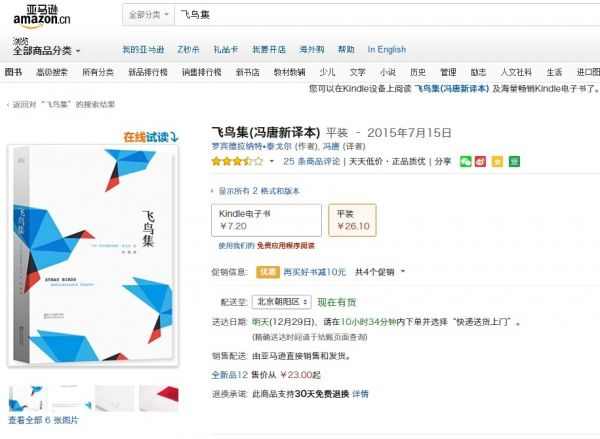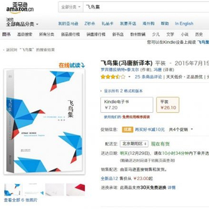 亚马逊网上依然有售冯唐翻译的《飞鸟集》