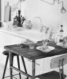 在一字形的厨房内放一张附有滑轮的高脚桌,桌面的一半受力借用厨房的灶台,当橱柜台面不够用时,这里也可以作为备菜区域使用。而就餐结束,把桌面推回料理台上,一点都不会占用厨房的空间。