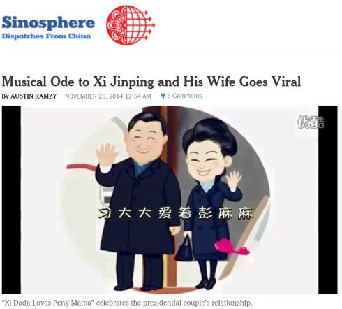 2014年底至2015年初,一首“神曲”《习大大爱着彭麻麻》走红网络,并很快引起外媒的关注,《纽约时报》专门发表文章《习近平和妻子彭丽媛的颂歌在中国热传》,并将歌词翻译成英语: